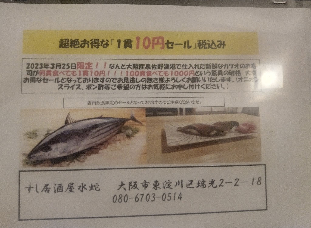 東淀川区上新庄!寿司一貫10円セール!カツオの寿司が一貫十円!